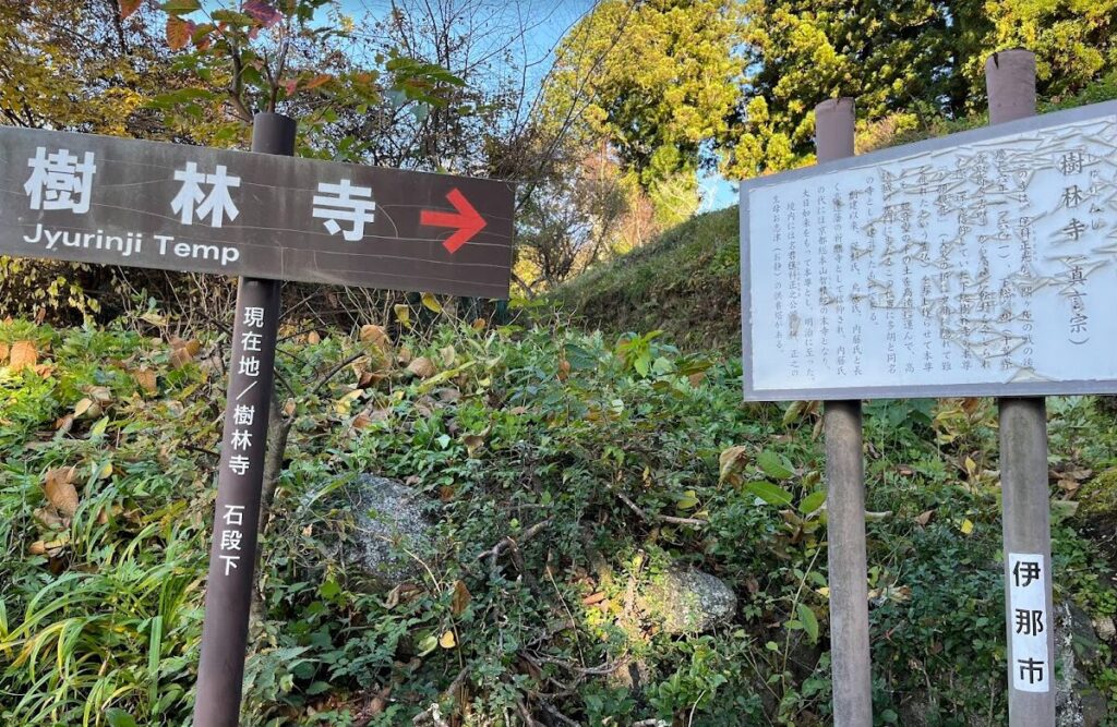 「的場の十王仏」をチェック後は小さな道をループ橋方面に曲がって田畑を横切ります。高遠中学校を右手に見ながら坂道を登り、ポレポレの丘を左手に見て更に坂道を進んでいくと雰囲気のある苔むした長い登り階段が見えてきます。階段のわきには樹林寺の看板。